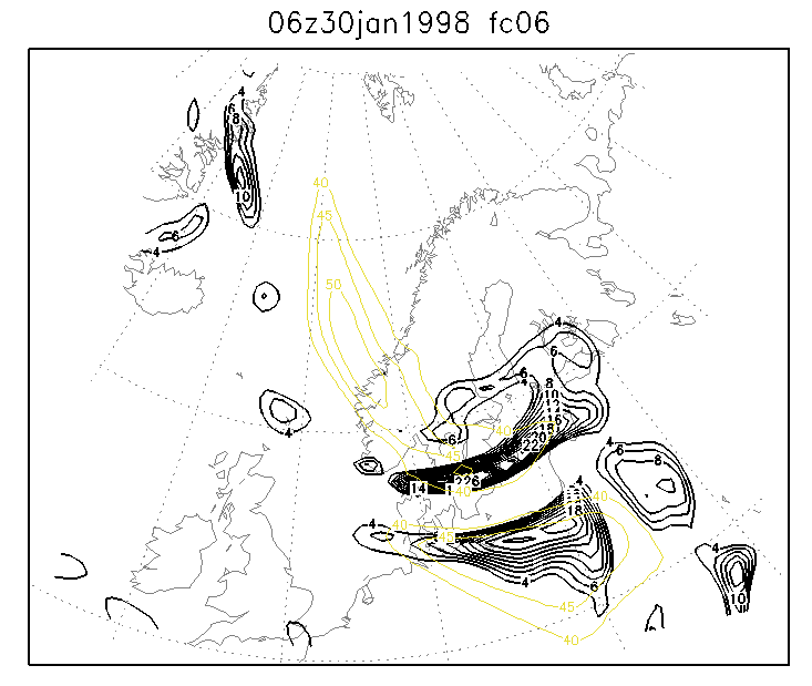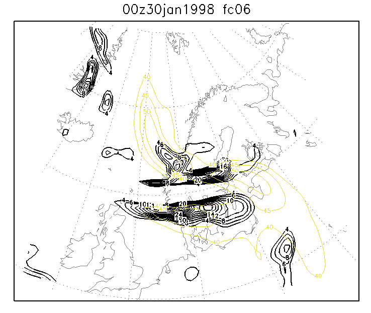 30 January 1998/06.00 UTC - Six-hourly HIRLAM forecast; yellow: isotachs 300 hPa, black: positive vorticity advection (PVA) 300 hPa