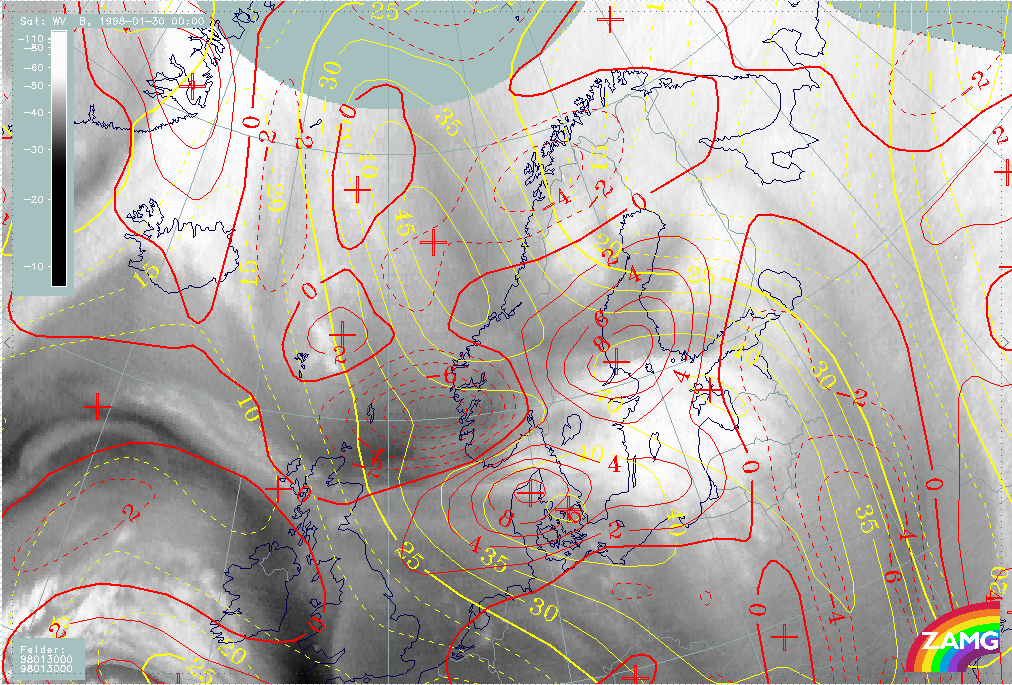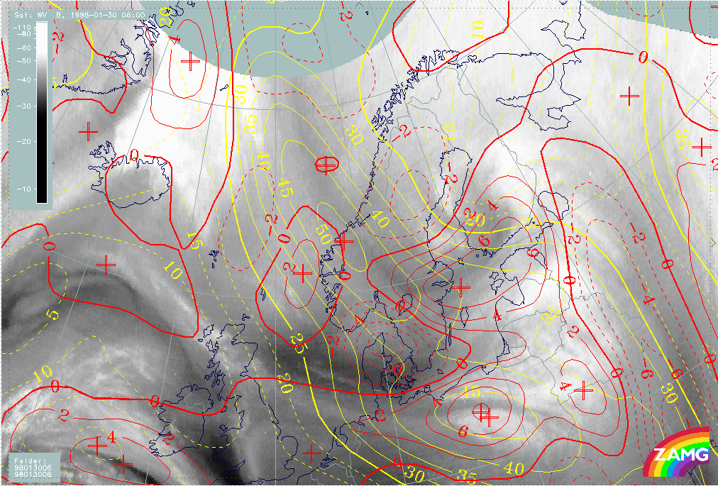 30 January 1998/06.00 UTC - Meteosat WV image; yellow: isotachs 300 hPa, red: vorticity advection 300 hPa