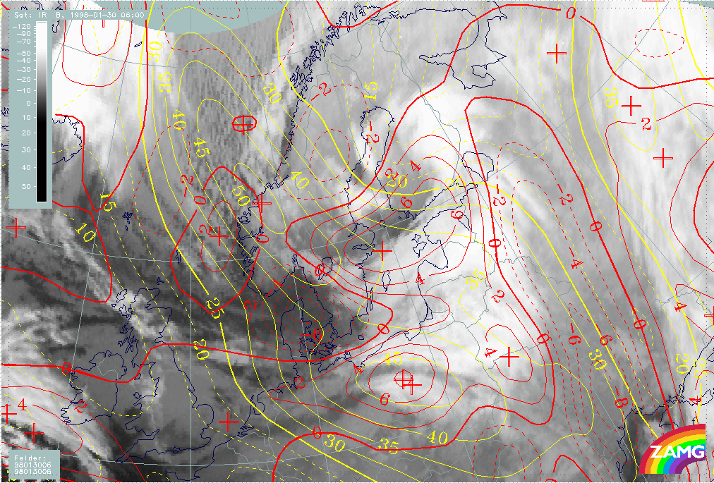 30 January 1998/06.00 UTC - Meteosat IR image; yellow: isotachs 300 hPa, red: vorticity advection 300 hPa