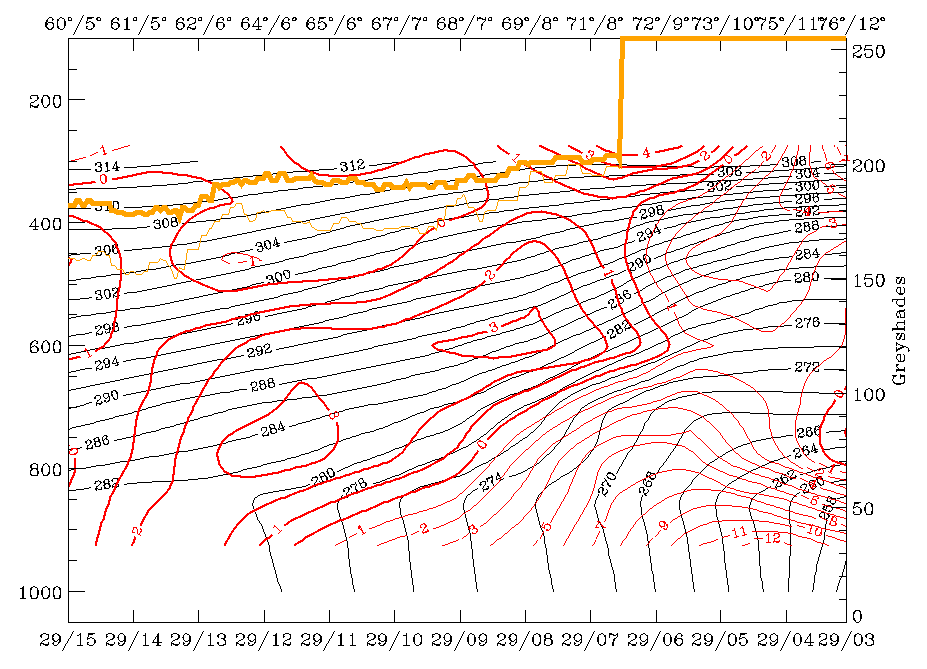 29 January 1998/00.00 UTC - Vertical cross section; black: isentropes (ThetaE), red thin: temperature advection - CA, red thick: