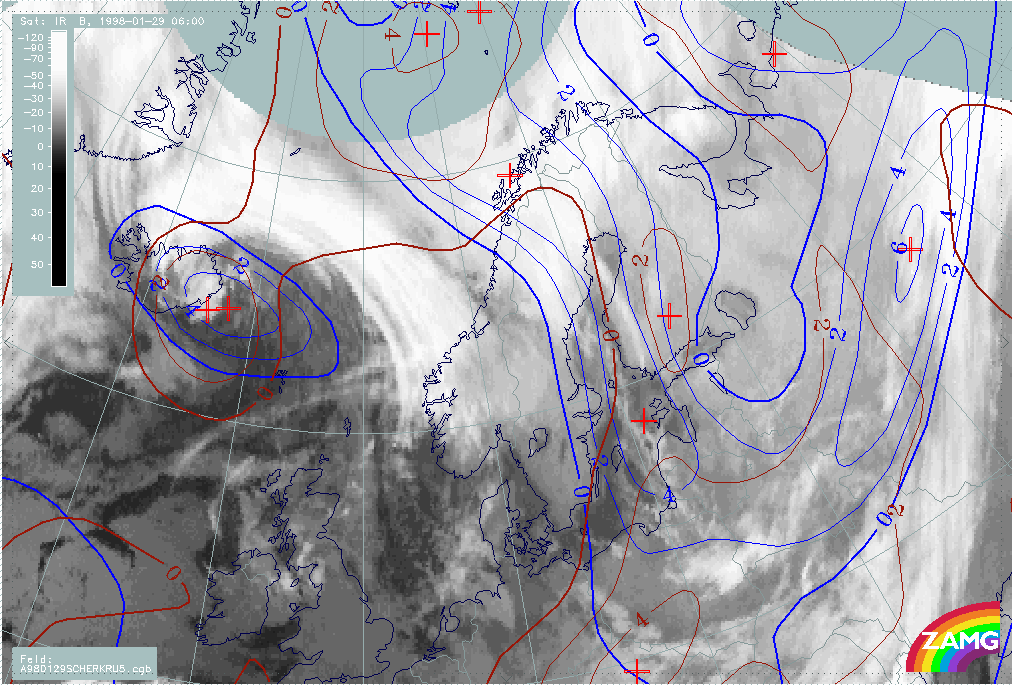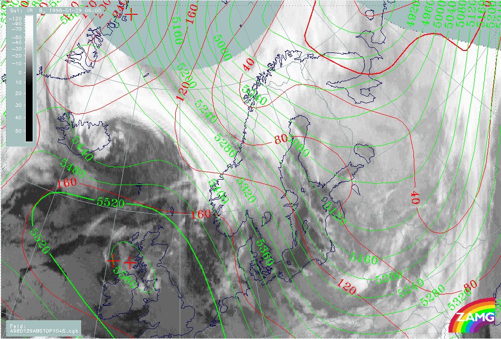 29 January 1998/06.00 UTC - Meteosat IR image; red: height contours 1000 hPa, green: height contours 500 hPa