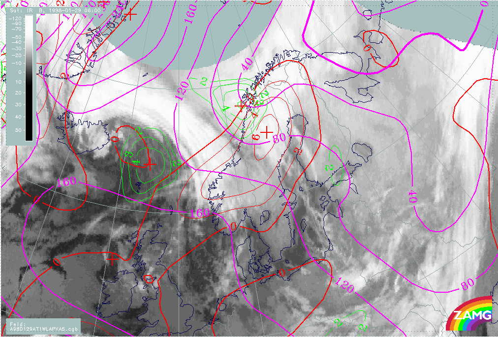 29 January 1998/06.00 UTC - Meteosat IR image; magenta: height contours 1000 hPa, green: positive vorticity advection (PVA) 500 hPa,