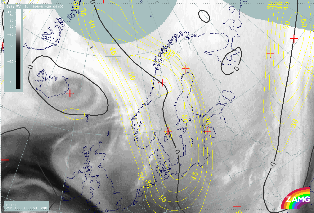 29 January 1998/06.00 UTC - Meteosat WV image; yellow: isotachs 300 hPa, black: shear vorticity 300 hPa
