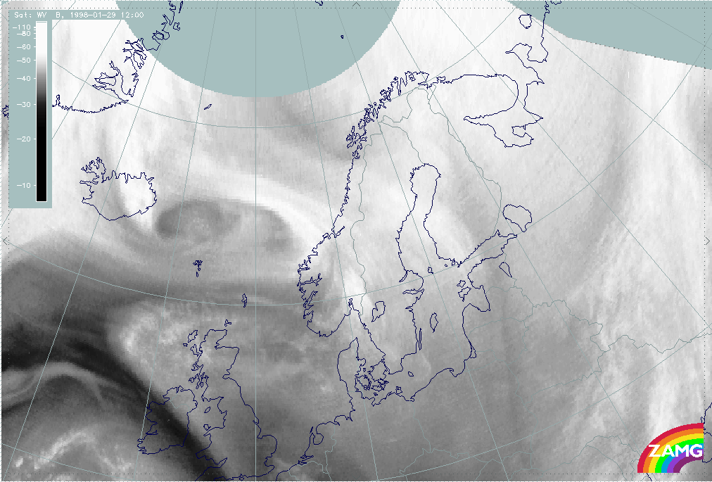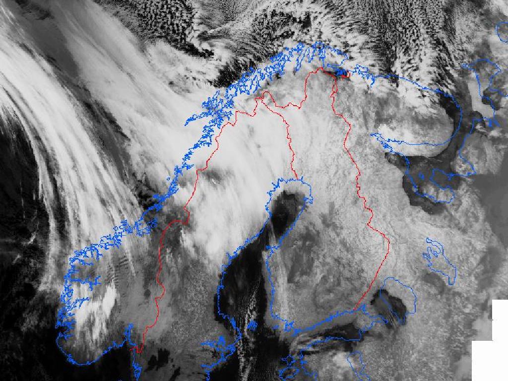 The evolution of the wave can be followed best with NOAA imagery (left and right images top). In the morning the wavy appearance is becoming clearer, and around noon the classical appearance of a Wave is evident. A structure which can be called a cloud head can be noticed over Sweden and Finland, centred around 65N/23E. The Meteosat water vapour image reveals a distinct higher WV cloud edge extending from 68N/10E - 65N/25E and a lower WV cloud bulge penetrating from below over Sweden and Finland around 66N/22E. A dry Dark Stripe extends from 72N/05E into northern Norway.