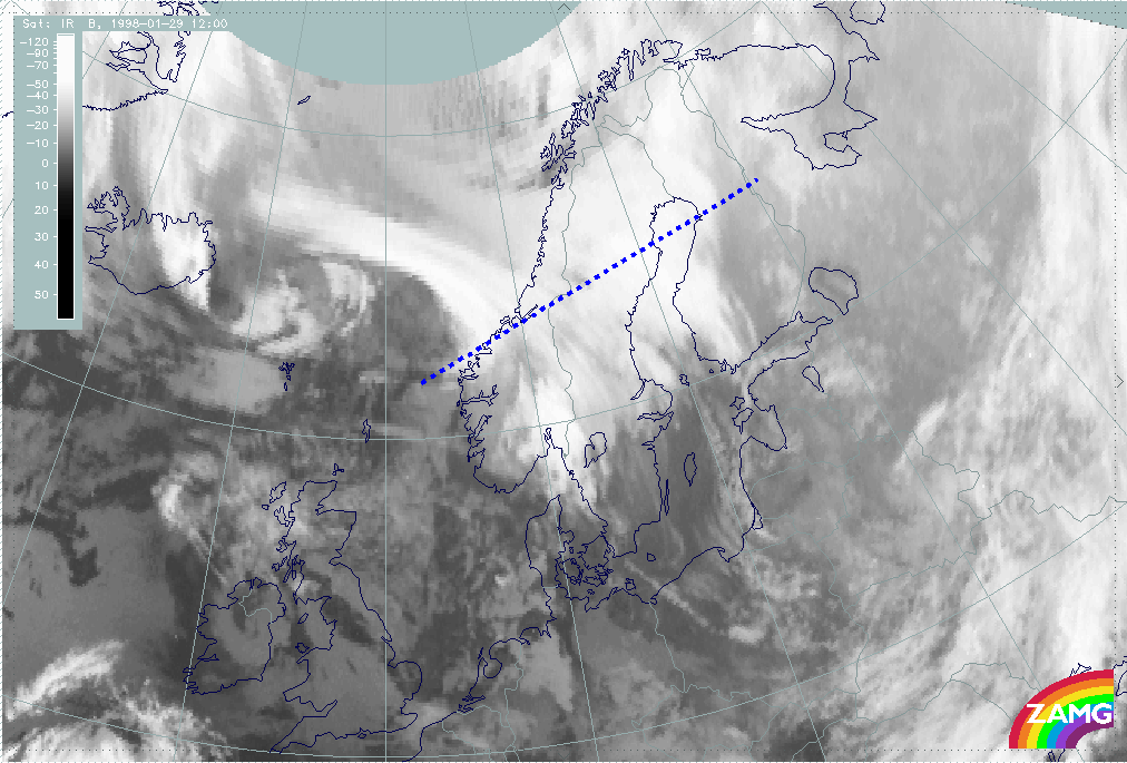29 January 1998/12.00 UTC - Meteosat IR image; position of vertical cross section indicated