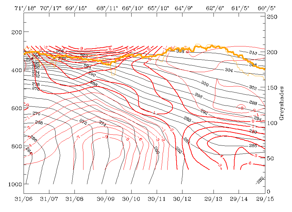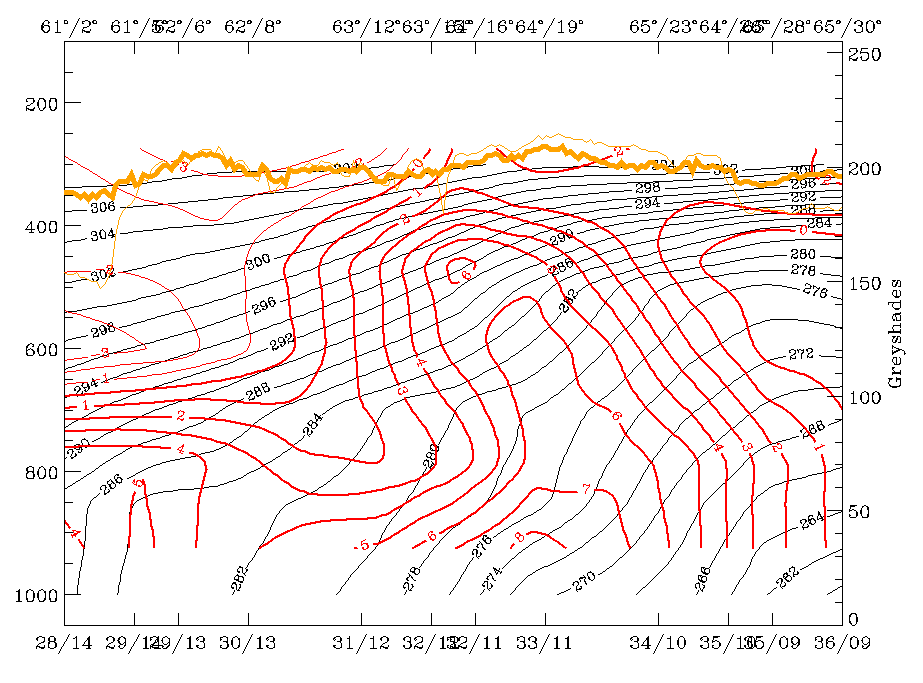 Another cross section taken perpendicular to the Cold Front over the Norwegian Sea shows the temperature advection across the front. The cold air outbreak has spread as far as latitude 65N, and comparison with the respective cross section 12 hours earlier (compare The synoptic situation over the Arctic Sea before the development; note reversed viewing angle) shows that the cold advection has grown significantly in depth, although the intensity in the lowest layers has somewhat decreased. This is a typical example of a transformation of a shallow Arctic Front into a one containing deeper baroclinity.