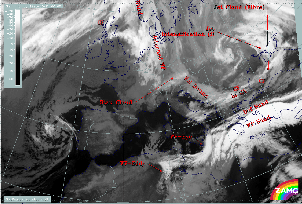 15 March 1998/06.00 UTC - Meteosat IR image; SatRep overlay: names of conceptual models