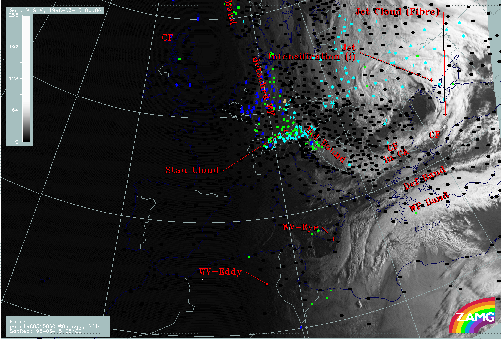 15 March 1998/06.00 UTC - Meteosat VIS image; weather events (green: rain and showers, blue: drizzle, cyan: snow, red: thunderstorm with precipitation, purple: freezing rain, orange: hail, black: no actual precipitation or thunderstorm with precipitation), SatRep overlay: names of conceptual models