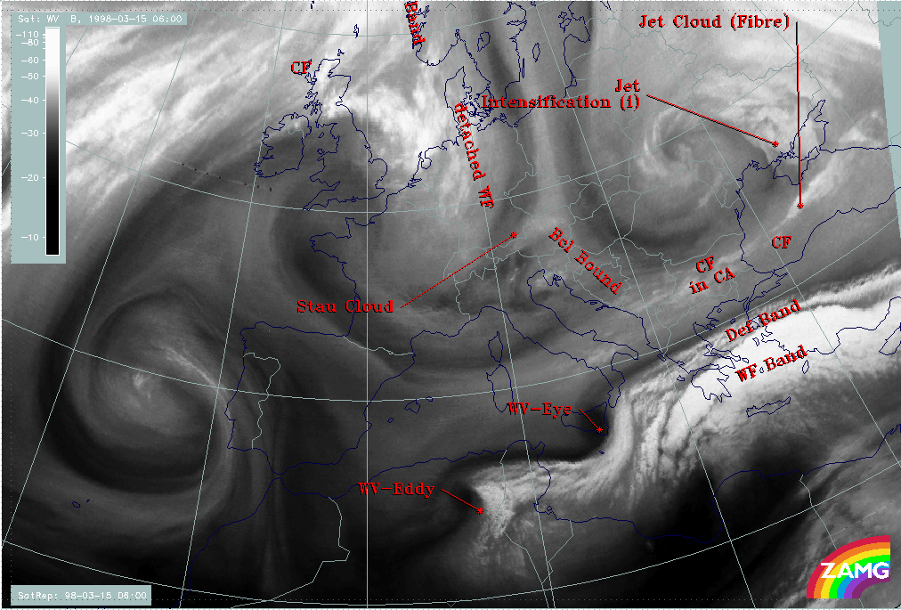 15 March 1998/06.00 UTC - Meteosat WV image; SatRep overlay: names of conceptual models