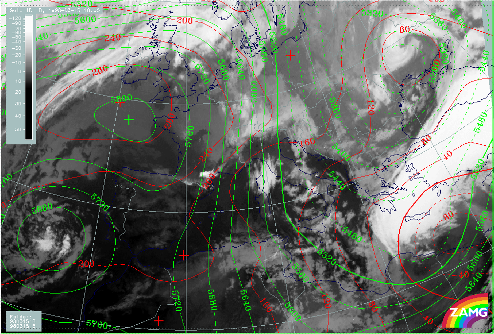 15 March 1998/18.00 UTC - Meteosat IR image; red: height contours 1000 hPa, green: height contours 500 hPa