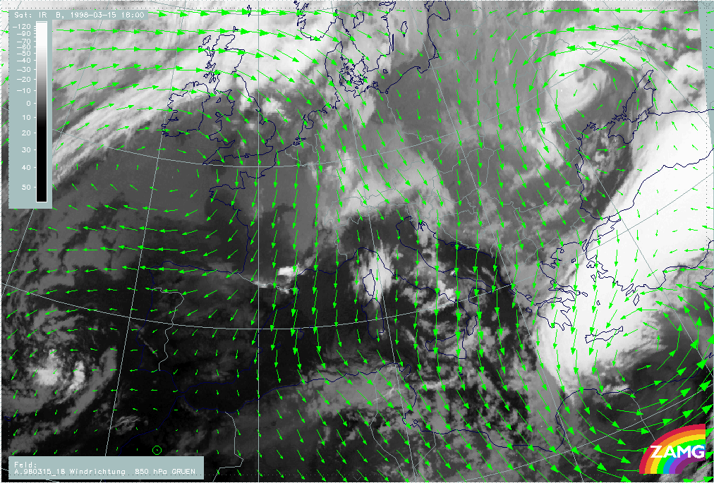 15 March 1998/18.00 UTC - Meteosat IR image; green: wind vectors 850 hPa
