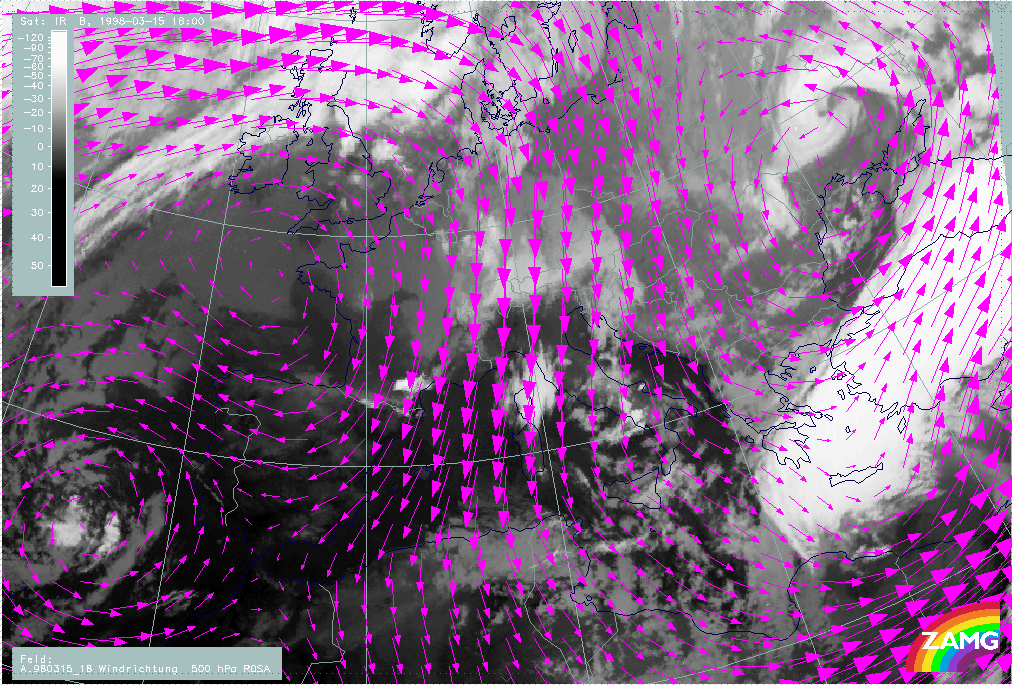 15 March 1998/18.00 UTC - Meteosat IR image; magenta: wind vectors 500 hPa