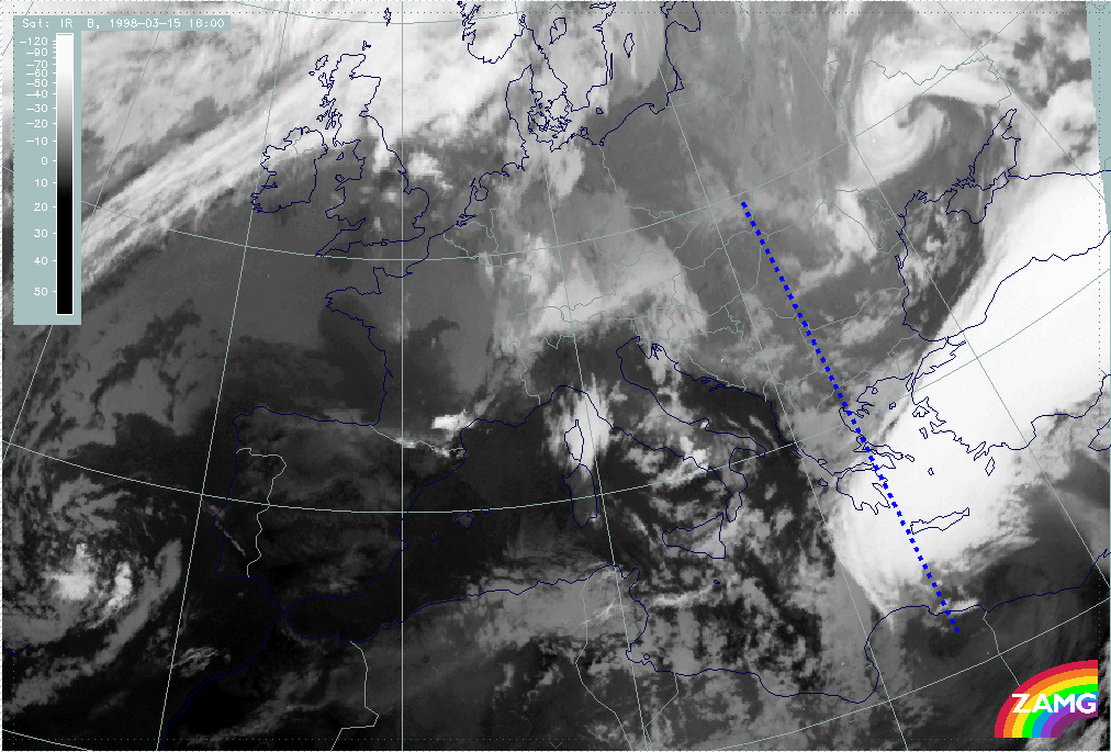 15 March 1998/18.00 UTC - Meteosat IR image; position of vertical cross section indicated