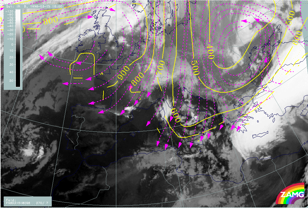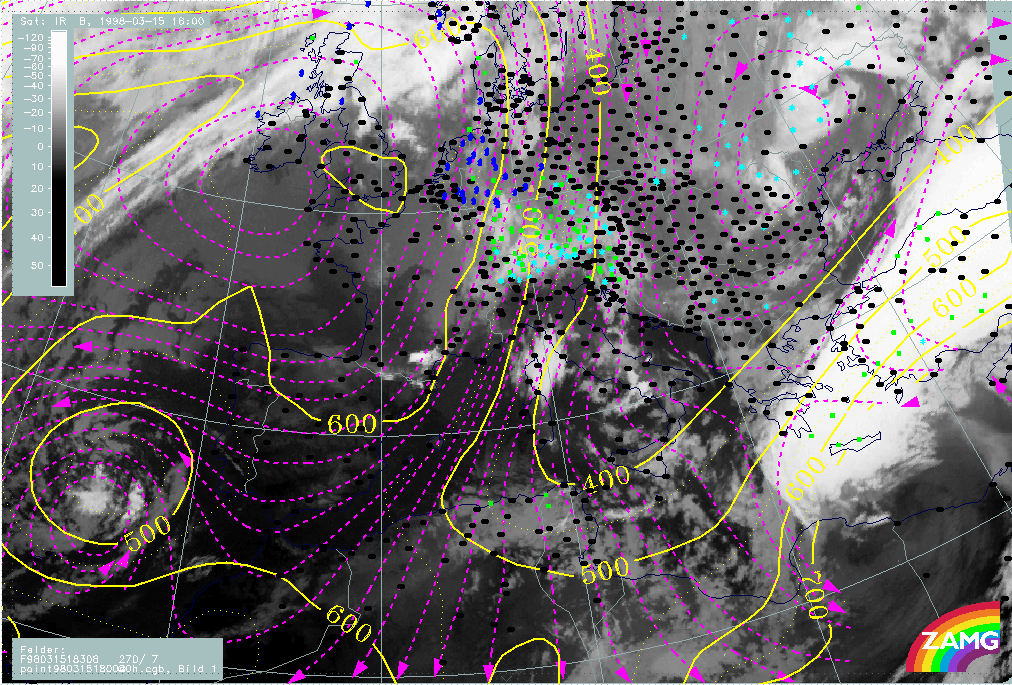 15 March 1998/18.00 UTC - Meteosat IR image; magenta: relative streams 298K - system velocity 270° 7 m/s, yellow: isobars