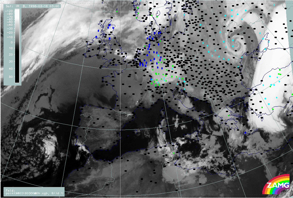 16 March 1998/03.00 UTC - Meteosat IR image; weather events (green: rain and showers, blue: drizzle, cyan: snow, red: thunderstorm with
