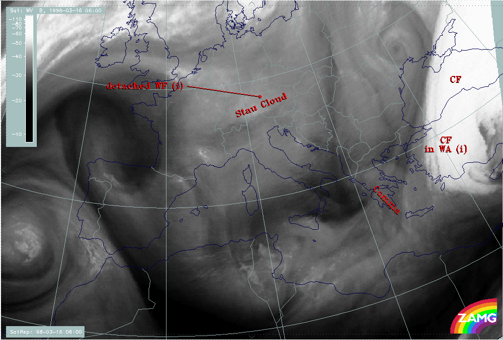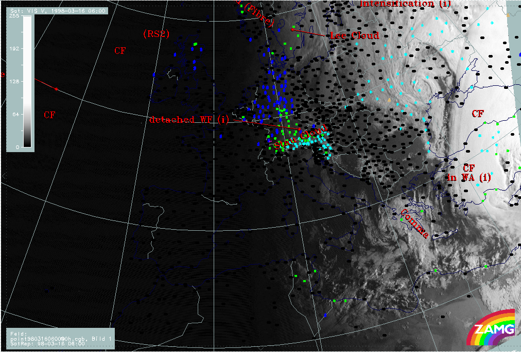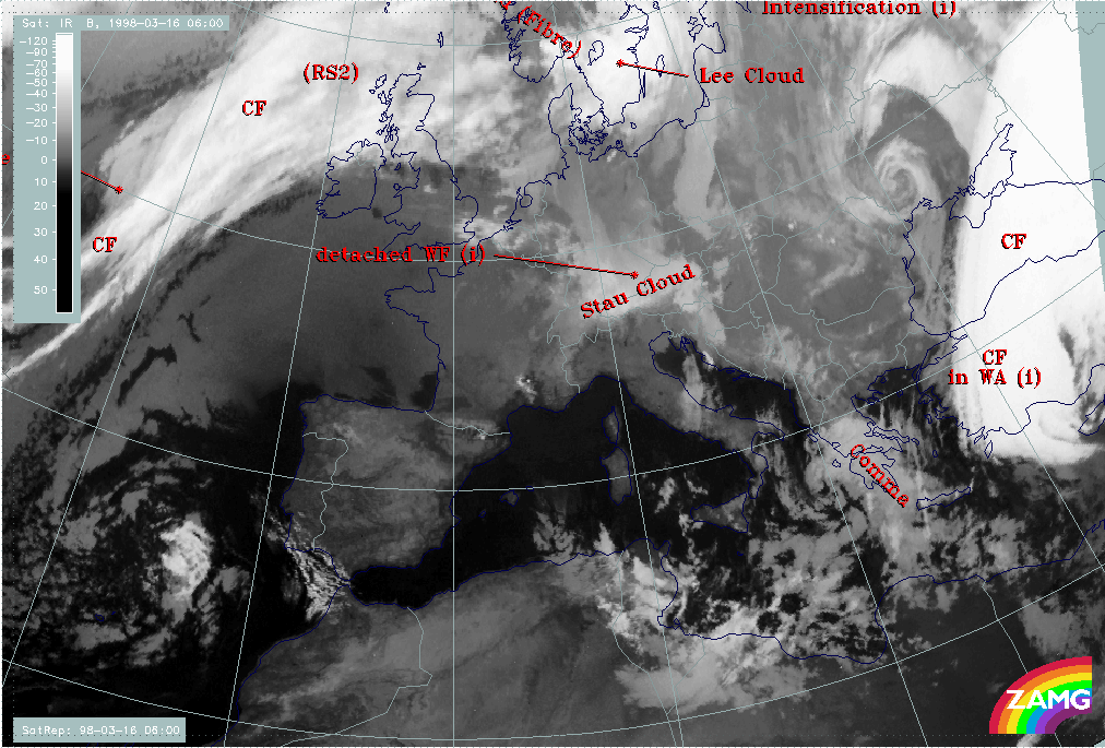 16 March 1998/06.00 UTC - Meteosat IR image; SatRep overlay: names of conceptual models
