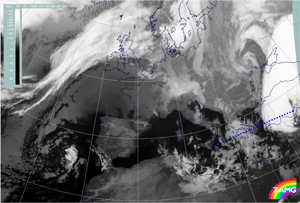16 March 1998/06.00 UTC - Meteosat IR image; position of vertical cross section indicated