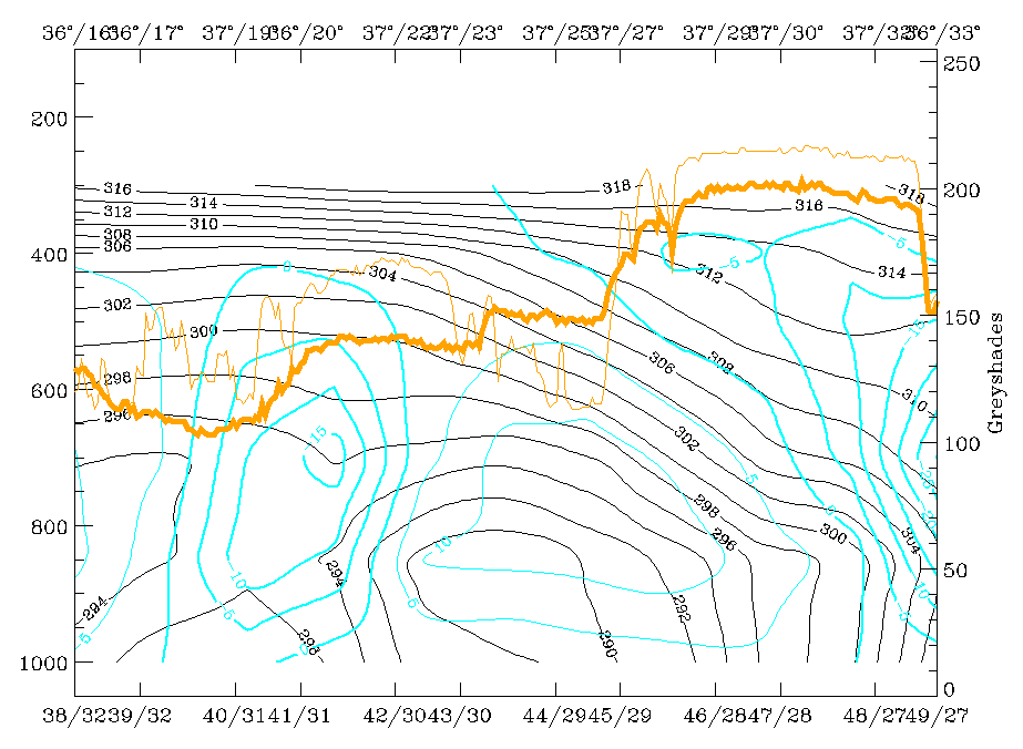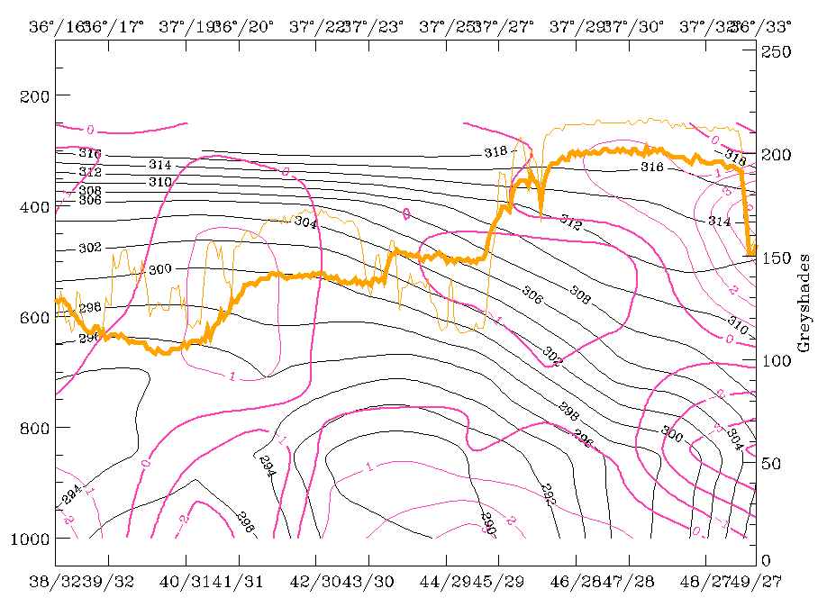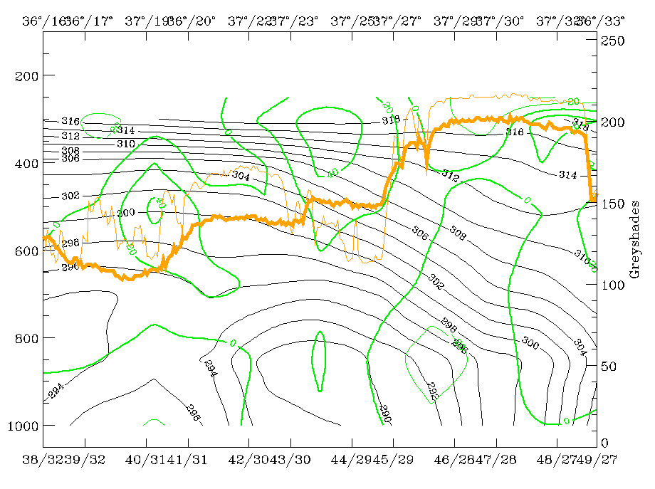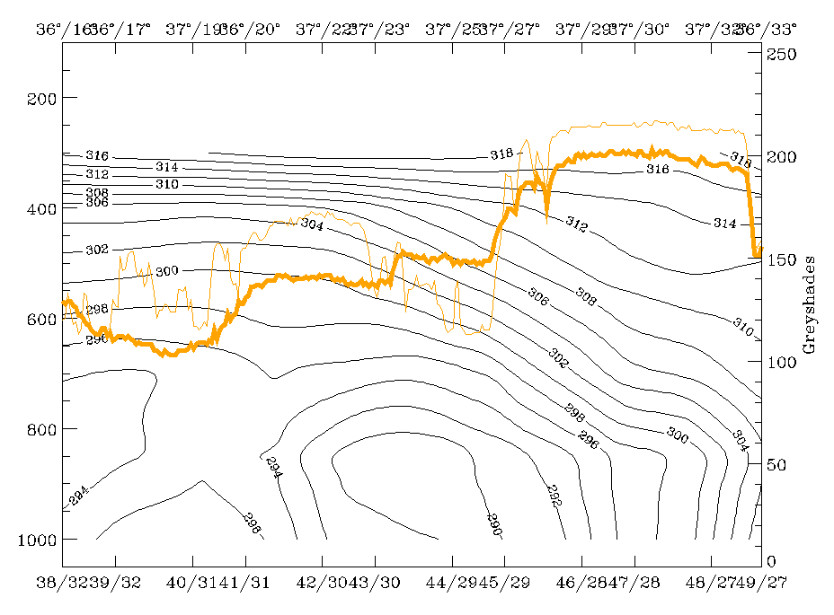 16 March 1998/00.00 UTC - Vertical cross section; black: isentropes (ThetaE), orange thin: IR pixel values, orange thick: WV pixel