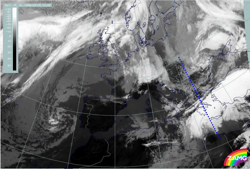 15 March 1998/12.00 UTC - Meteosat IR image; position of vertical cross section indicated