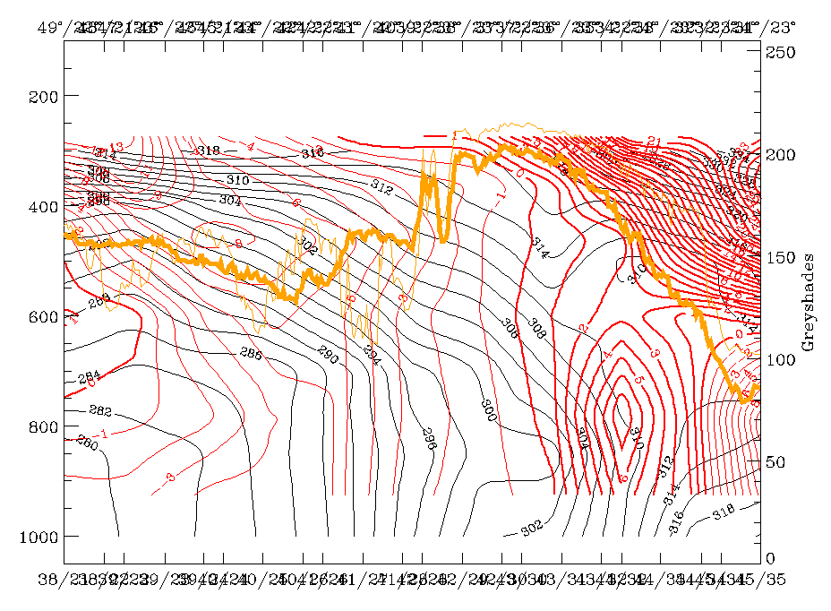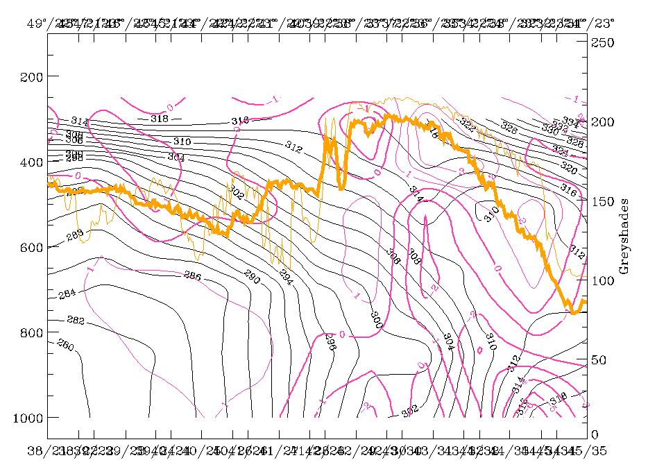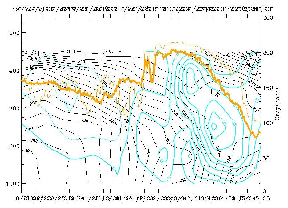 15 March 1998/12.00 UTC - Vertical cross section; black: isentropes (ThetaE), orange thin: IR pixel values, orange thick: WV pixel