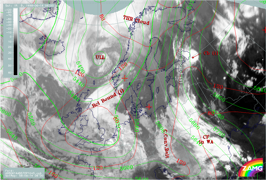 14 June 1998/06.00 UTC - Meteosat IR image; red: height contours 1000 hPa, green: height contours 500 hPa
