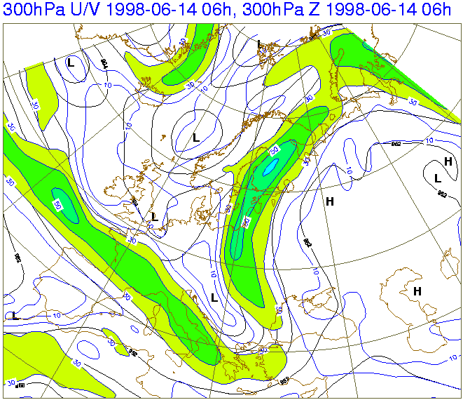 14 June 1998/06.00 UTC - black: height contours 300 hPa, blue: isotachs