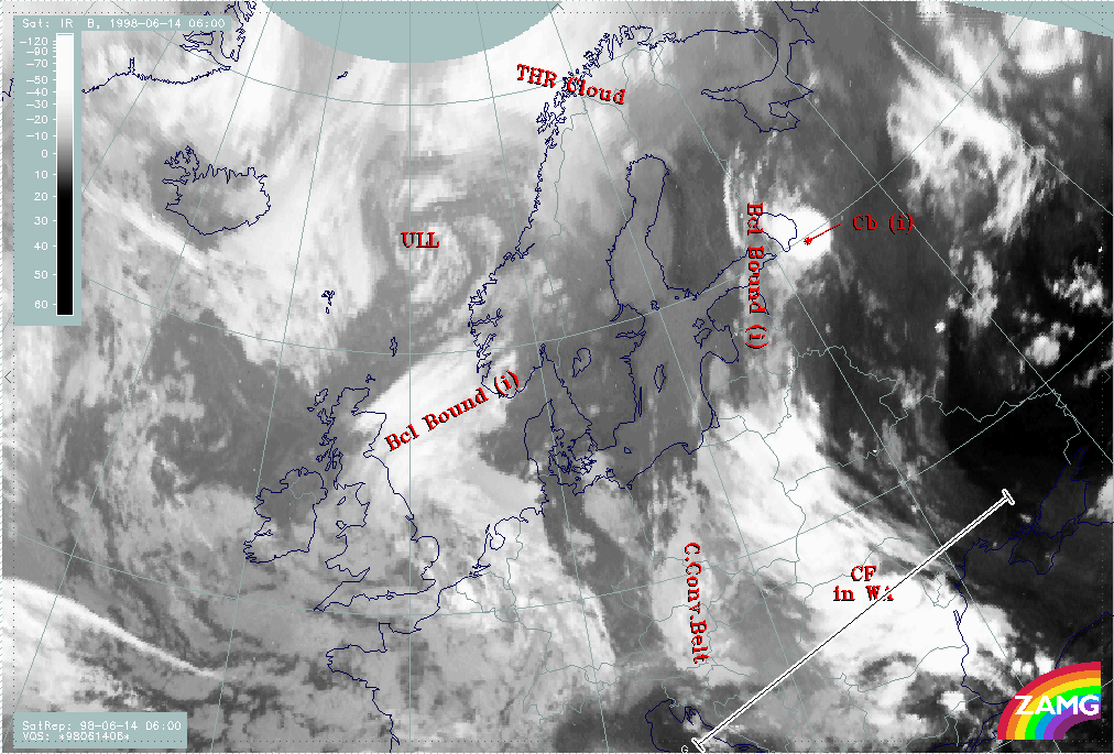 14 June 1998/06.00 UTC - Meteosat IR image; SatRep overlay: names of conceptual models; position of vertical cross section indicated