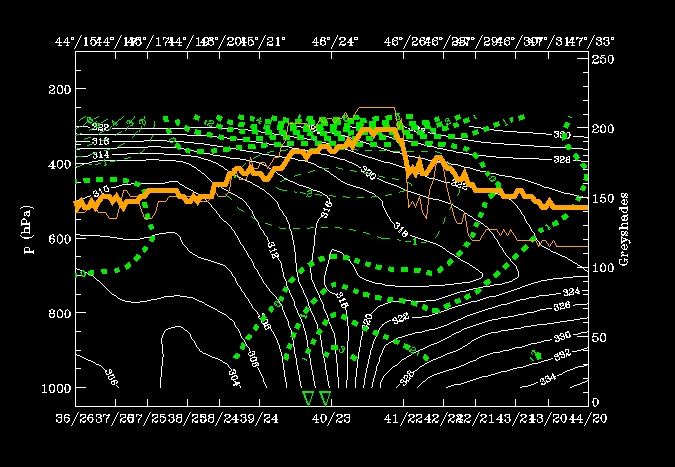 14 June 1998/06.00 UTC - Vertical cross section; white: isentropes (ThetaE), green thin: temperature advection - CA, green thick: