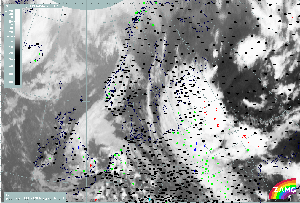 14 June 1998/18.00 UTC - Meteosat IR image; weather events (green: rain and showers, blue: drizzle, cyan: snow, red: thunderstorm with