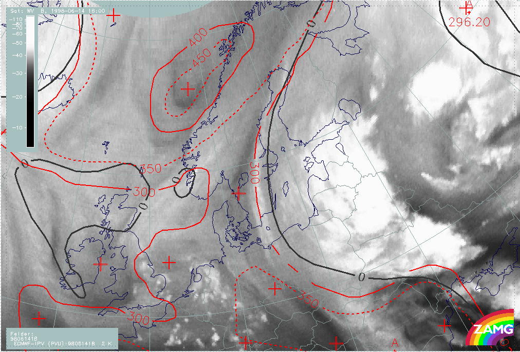 14 June 1998/18.00 UTC - Meteosat WV image; red: height of PV=2 units, black: shear vorticity 300 hPa