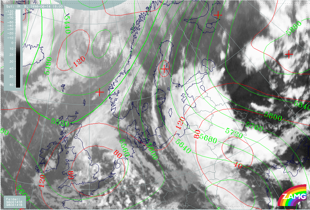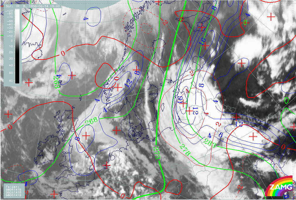 14 June 1998/18.00 UTC - Meteosat IR image; red: height contours 1000 hPa, green: height contours 500 hPa