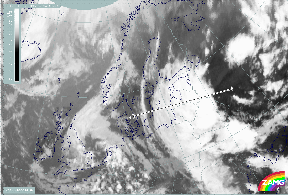 We continue with a more thorough analysis of the frontal cloud bands from 14 June 06.00 UTC. By 18.00 UTC a Warm Front cloud band is stretching from Poland over White Russia to the Baltic States and Finland (H33a). Precipitation is observed within the southern part of the Warm Front and many thunderstorms were reported along the eastern parts of the Warm Front.