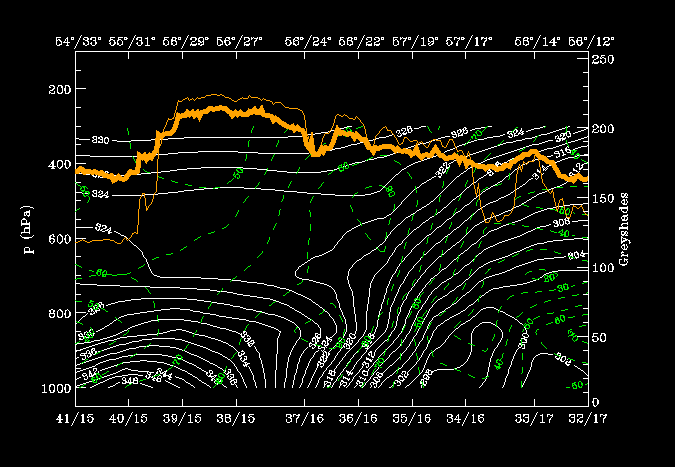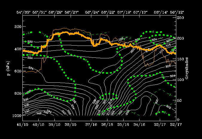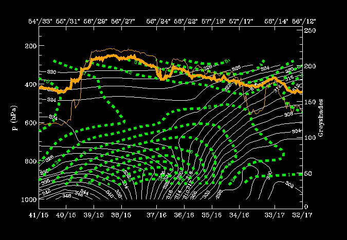 Within the frontal zone, the isentropes are inclined downward from 400 to 900 hPa and the relative streams are strongly descending, which is very typical for the lower part of the frontal surface (H43).