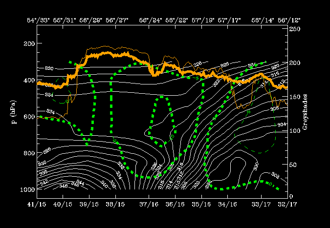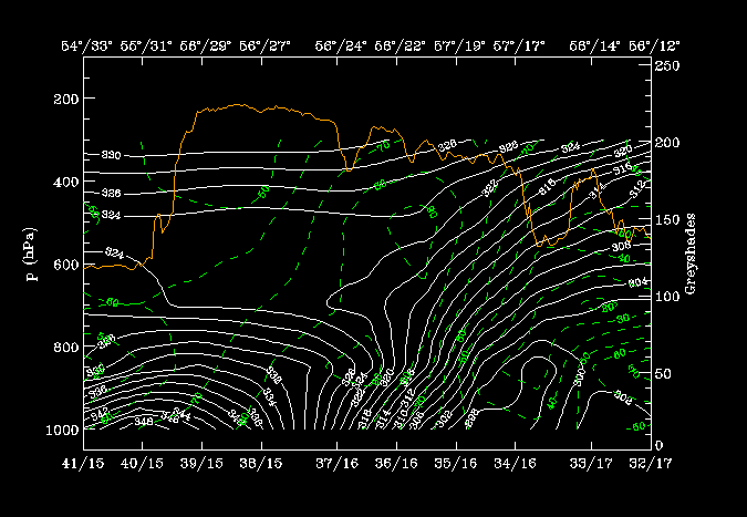 14 June 1998/18.00 UTC - Vertical cross section; white: isentropes (ThetaE), green: relative humidity, orange thin: IR pixel values,