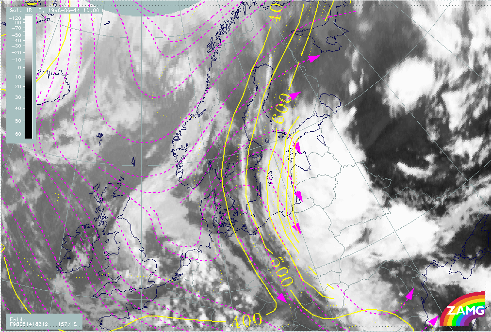 14 June 1998/18.00 UTC - Meteosat IR image; magenta: relative streams 322K, yellow: isobars