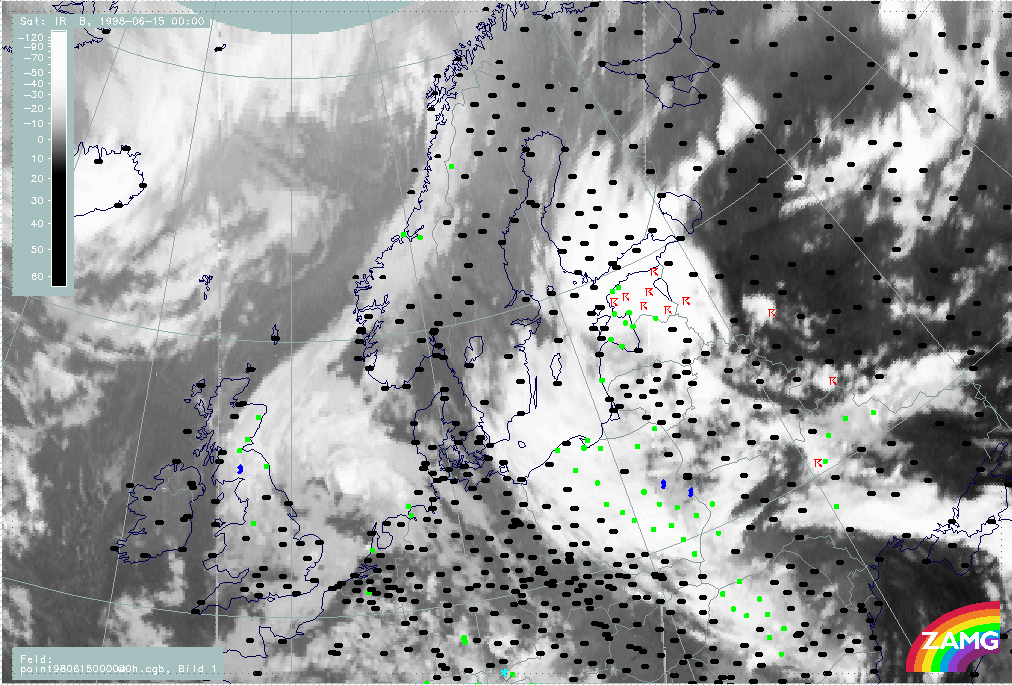 15 June 1998/00.00 UTC - Meteosat IR image; weather events (green: rain and showers, blue: drizzle, cyan: snow, red: thunderstorm with