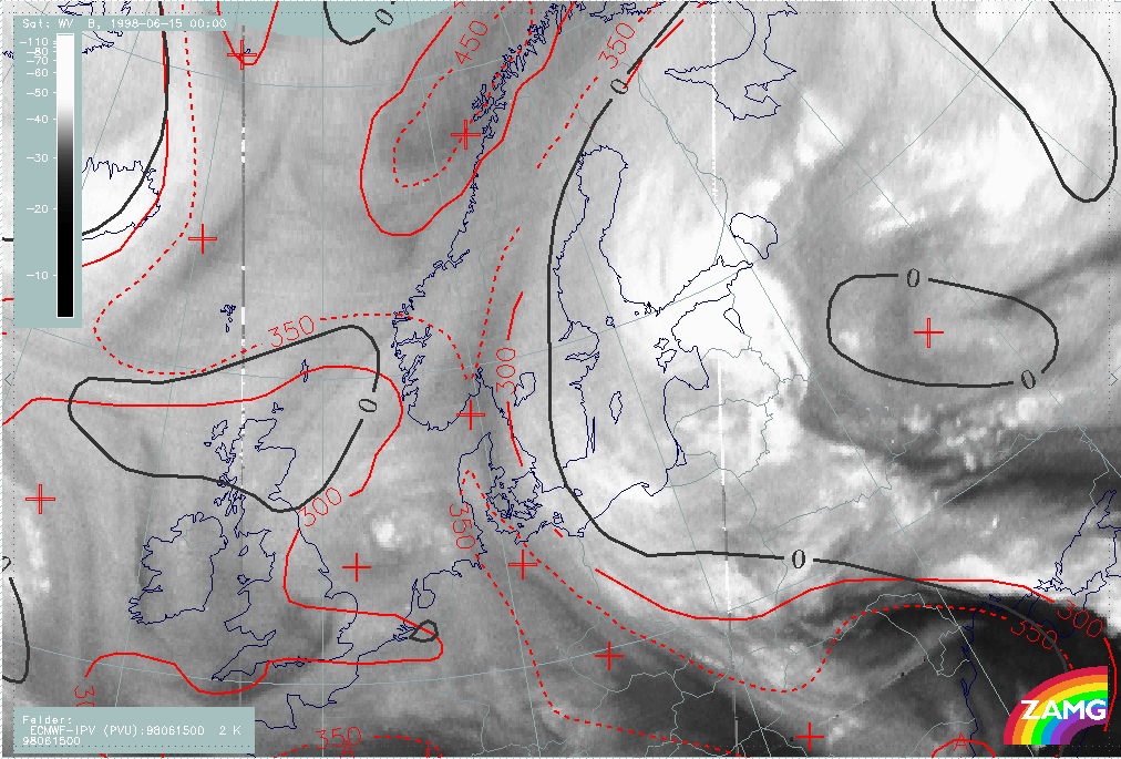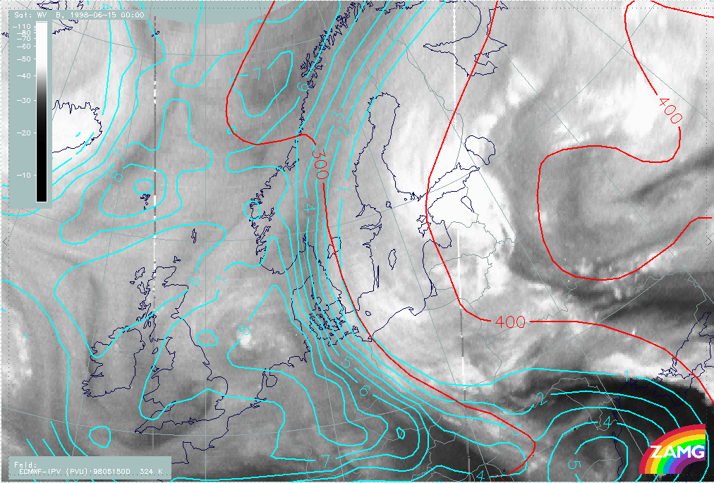 15 June 1998/00.00 UTC - Meteosat WV image; cyan: height of PV=2 units 324K, red: isobars 324K