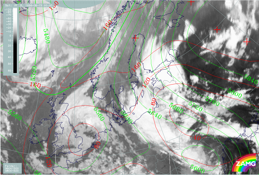 15 June 1998/00.00 UTC - Meteosat IR image; red: height contours 1000 hPa, green: height contours 500 hPa