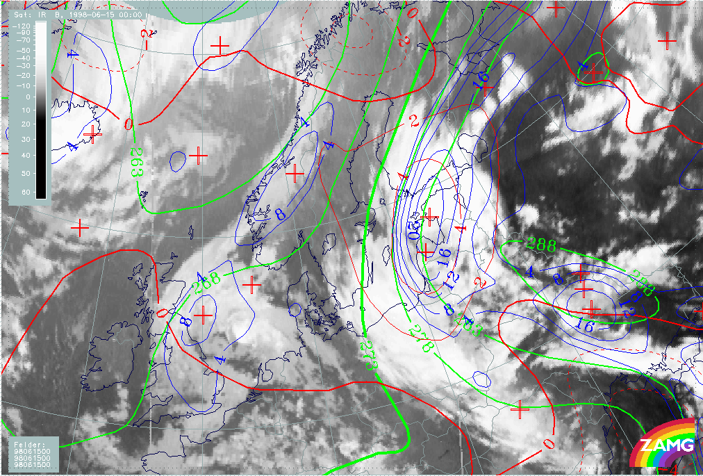 15 June 1998/00.00 UTC - Meteosat IR image; blue: thermal front parameter (TFP) 500/850 hPa, green: equivalent thickness 500/850 hPa,