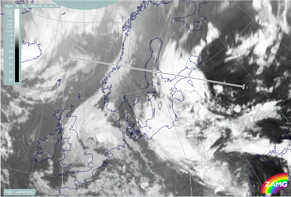 15 June 1998/00.00 UTC - Meteosat IR image; position of vertical cross section indicated