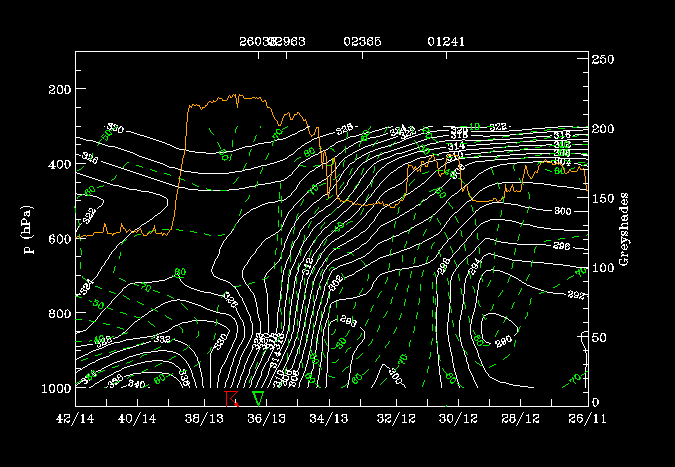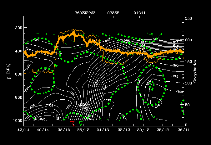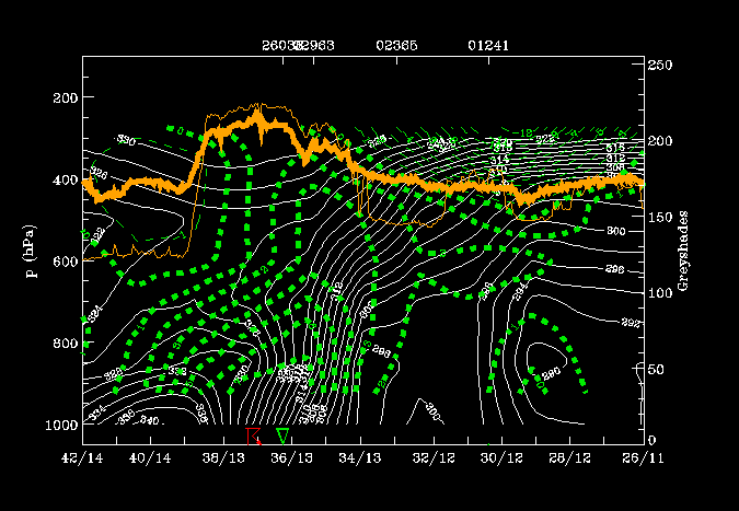 15 June 1998/00.00 UTC - Vertical cross section; white: isentropes (ThetaE), green: relative humidity, orange thin: IR pixel values,
