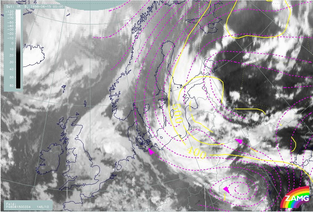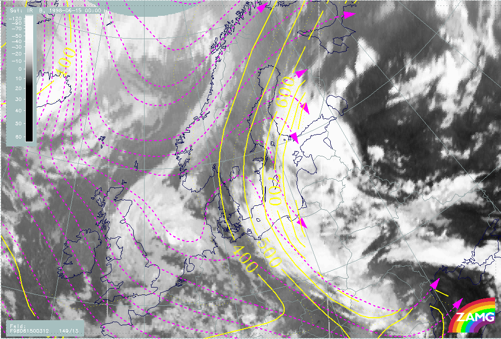 15 June 1998/00.00 UTC - Meteosat IR image; magenta: relative streams 312K, yellow: isobars