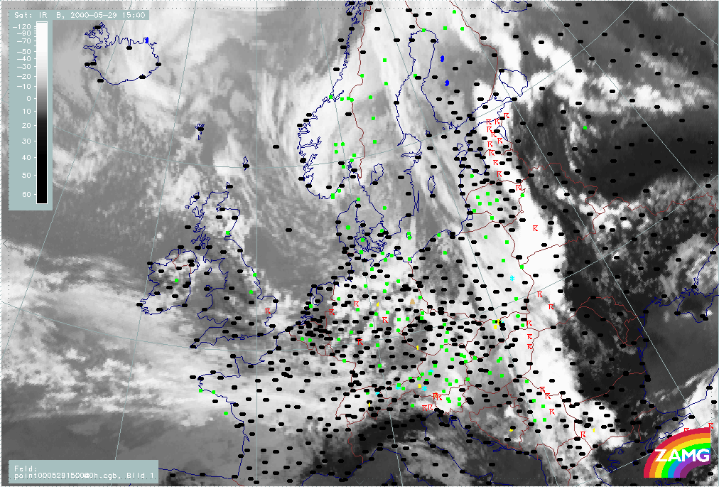 29 May 2000/15.00 UTC - Meteosat IR image; weather events (green: rain and showers, blue: drizzle, cyan: snow, red: thunderstorm with