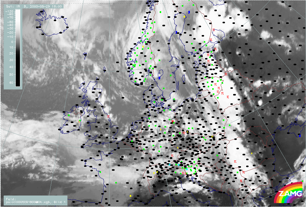 29 May 2000/18.00 UTC - Meteosat IR image; weather events (green: rain and showers, blue: drizzle, cyan: snow, red: thunderstorm with