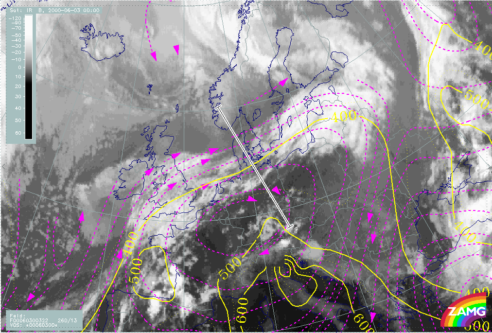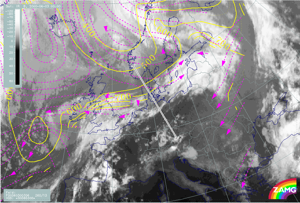 03 June 2000/00.00 UTC - Meteosat IR image; magenta: relative streams 312K - system velocity: 260° 13 m/s, yellow: isobars,