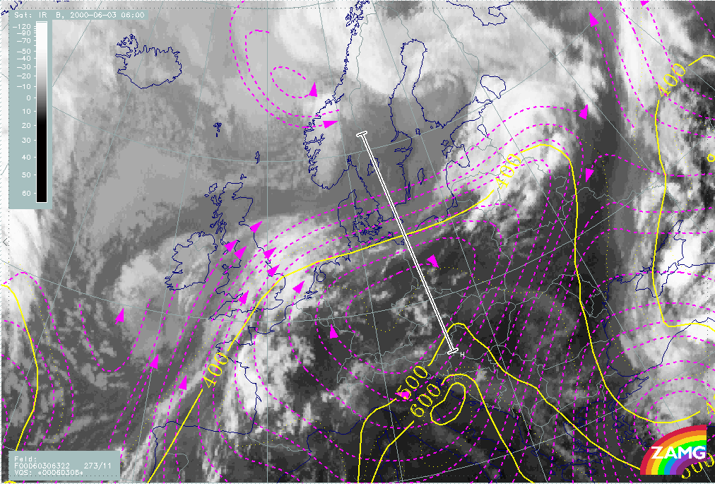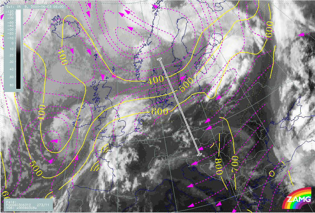03 June 2000/06.00 UTC - Meteosat IR image; magenta: relative streams 306K - system velocity: 273° 11 m/s, yellow: isobars,