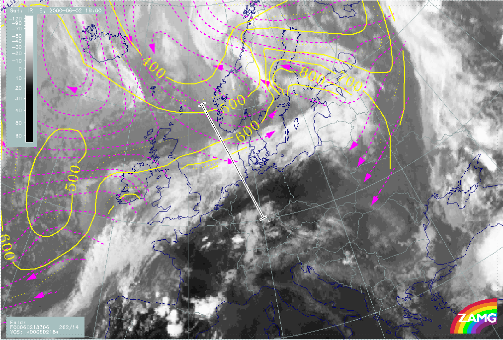 02 June 2000/18.00 UTC - Meteosat IR image; magenta: relative streams 312K - system velocity: 262° 14 m/s, yellow: isobars,