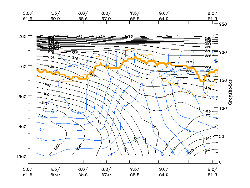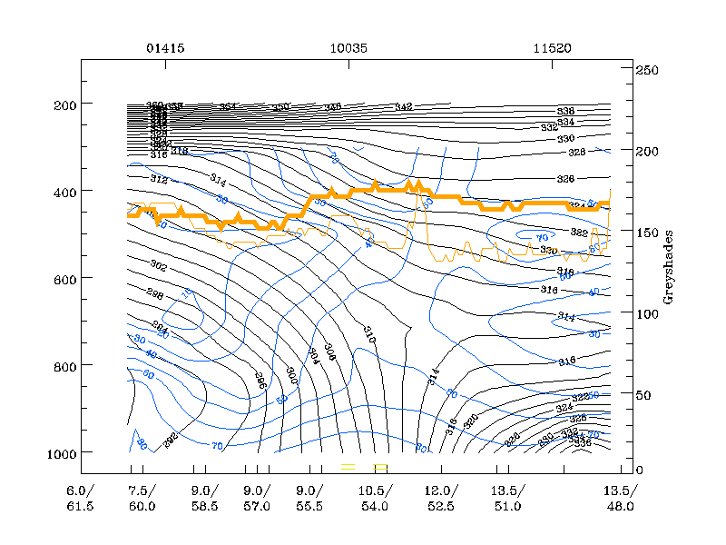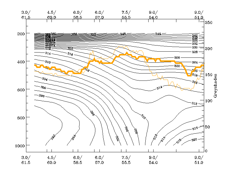 03 June 2000/06.00 UTC - Vertical cross section; black: isentropes (ThetaE), orange thin: IR pixel values, orange thick: WV pixel values