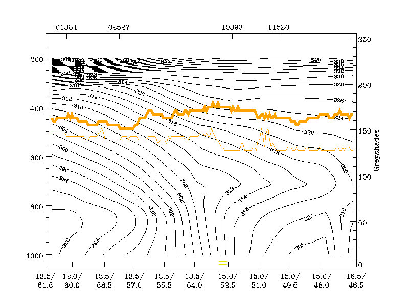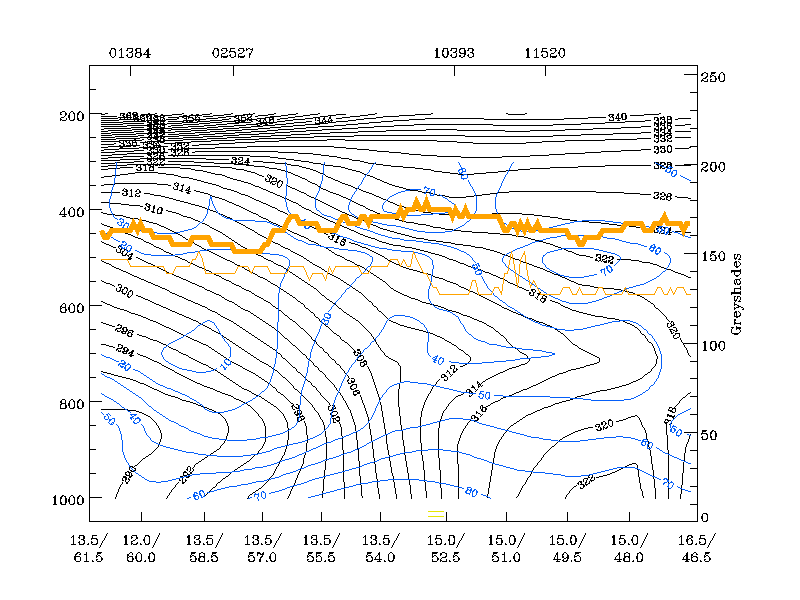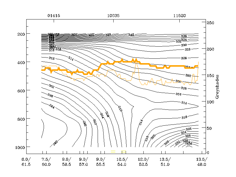03 June 2000/00.00 UTC - Vertical cross section; black: isentropes (ThetaE), orange thin: IR pixel values, orange thick: WV pixel values