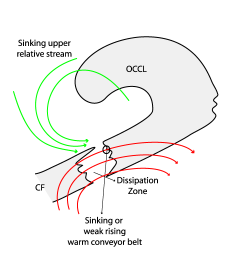 The physics of a Front Decay is well described using relative streams (see Conceptual Models: Front Decay - Meteorological physical background ). One of the three typical configurations show the involvement of air rotating around the centre of the main low attached to the frontal system. A sinking upper relative stream from the rear (upper relative stream and/or dry intrusion) develops, which flows at nearly right angles to the frontal cloud band at low and middle levels, leading to the characteristic dissipation of cloudiness. At upper levels, a sinking or only very weakly rising Warm Conveyor Belt can be observed.